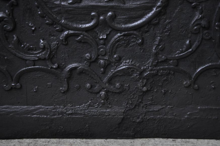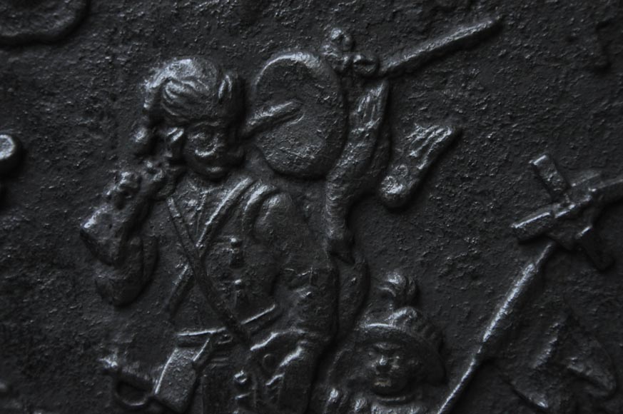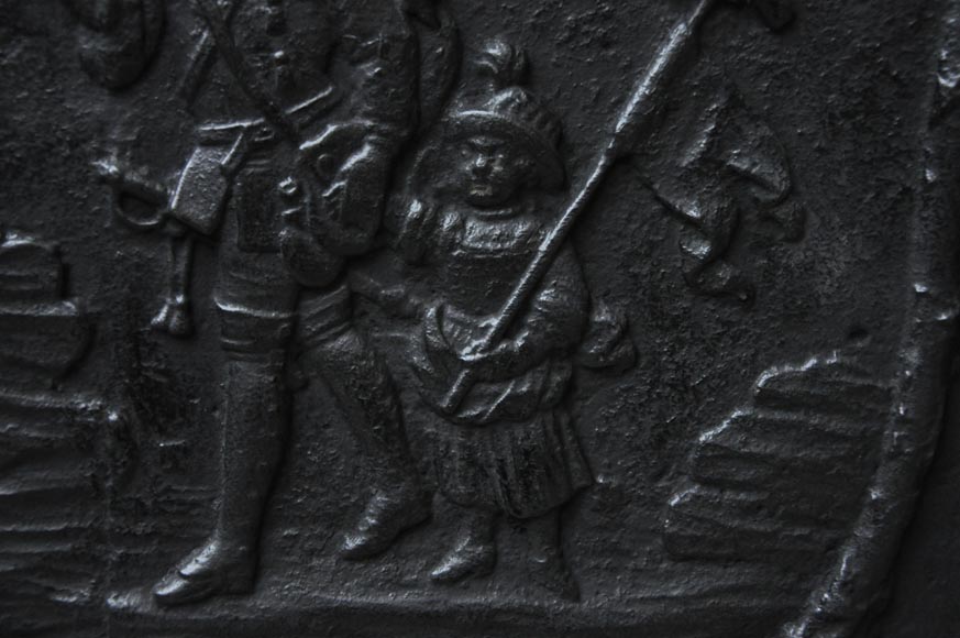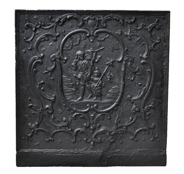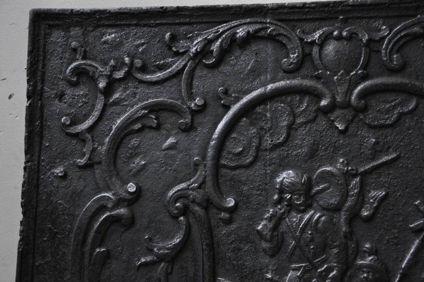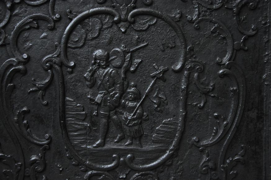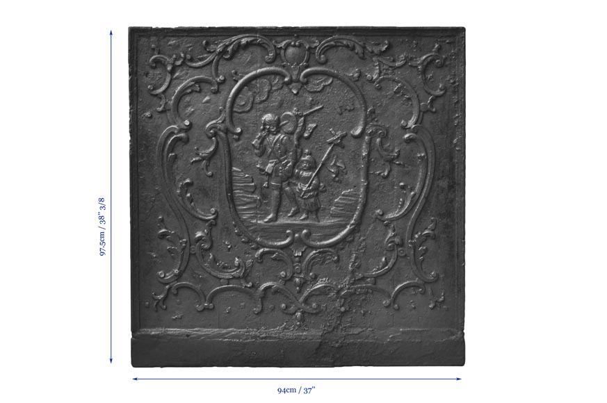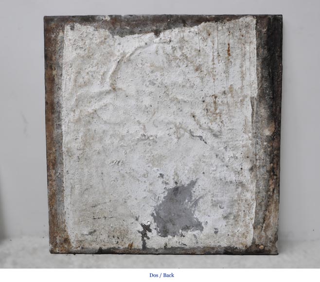 Featuring a square shape, this antique fire back was made during the 18th century. In a rockery scene, two hunters are dressed in oriental clothing.