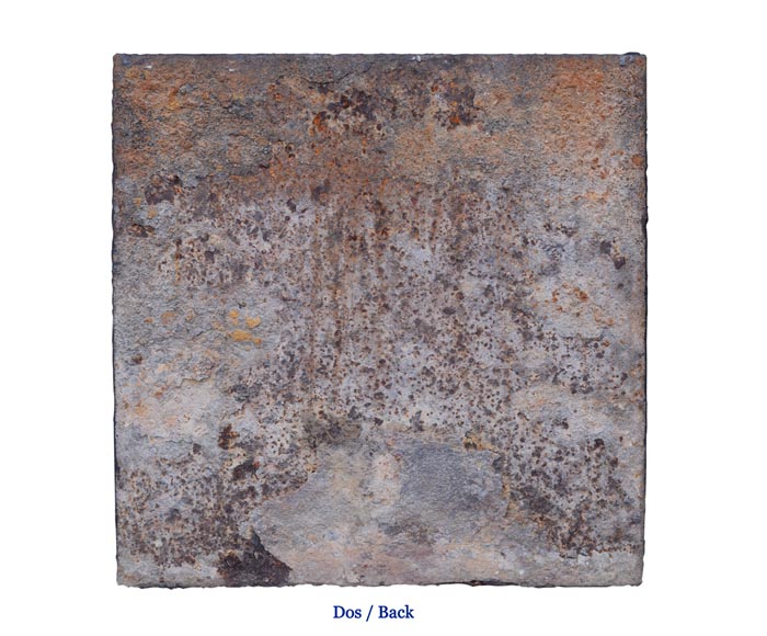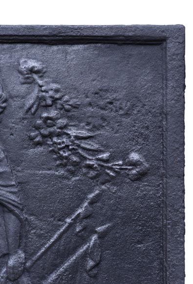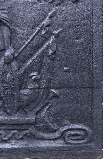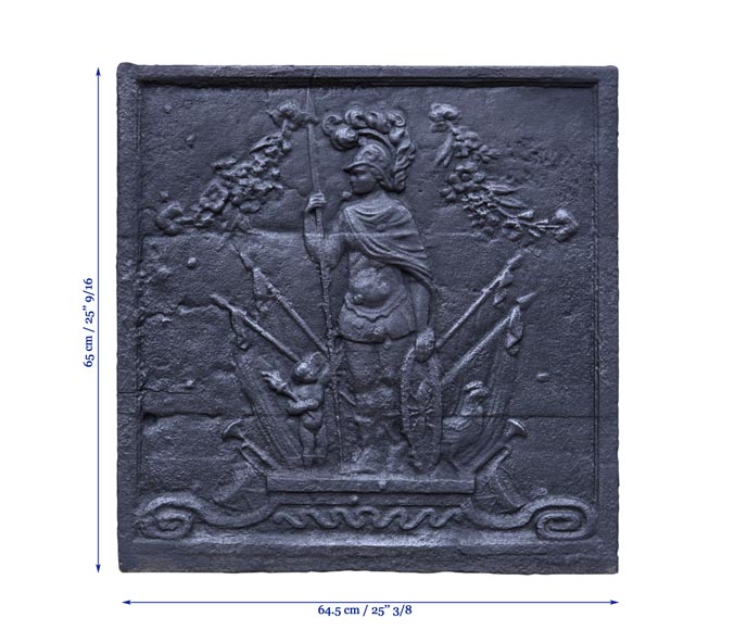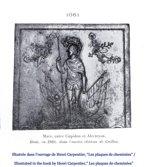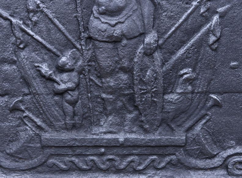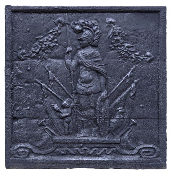 This fireback dates back to the 18th century. It represents the God Mars in armor, standing between Cupid, in his form of child holding a torch, and Alectryon, in the form of a rooster.