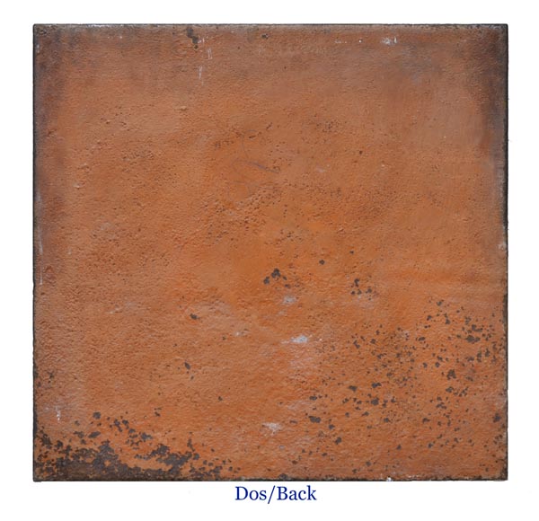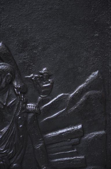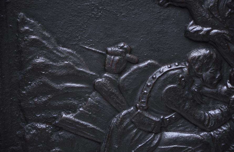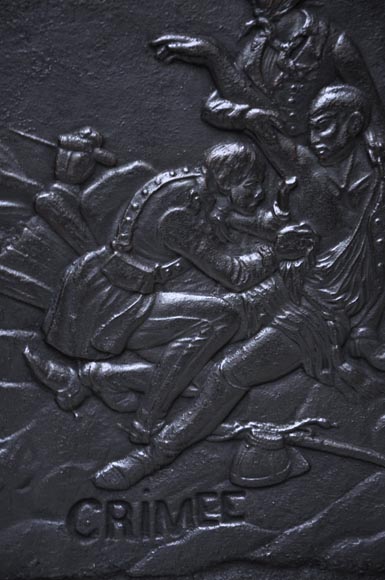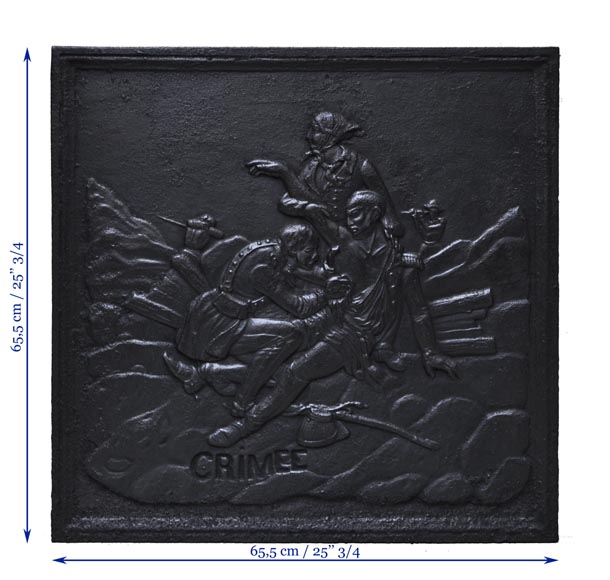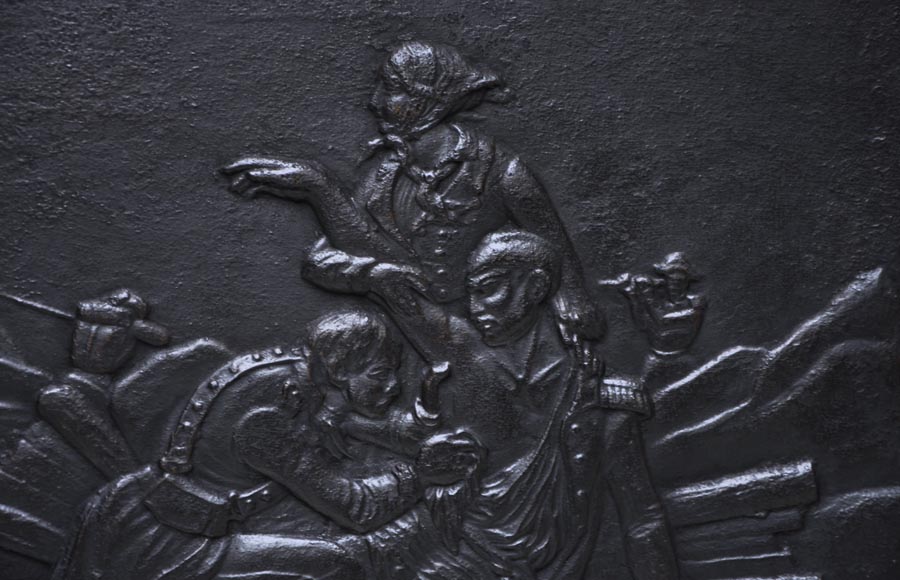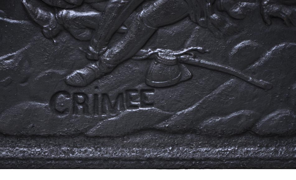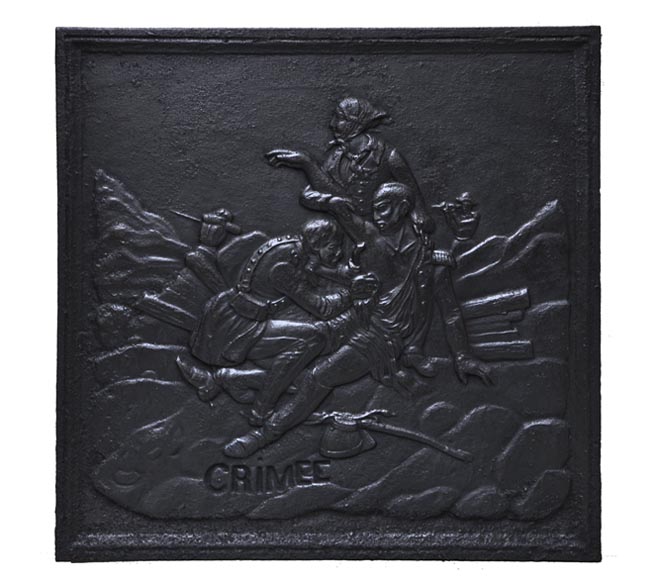 Small fireback made out of cast iron in the 20th century. It represents a wounded soldier during an episode of the Crimean War, a conflict between the Russian Empire and a coalition of the Ottoman Empire, the Empire of Napoleon III, the United Kingdom and the Kingdom of Sardinia, 1854-1856. It is triggered by the fear of the declining Ottoman Empire fall to Russian expansionism.