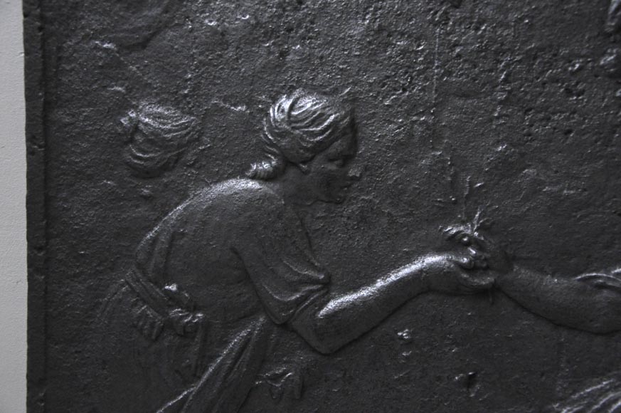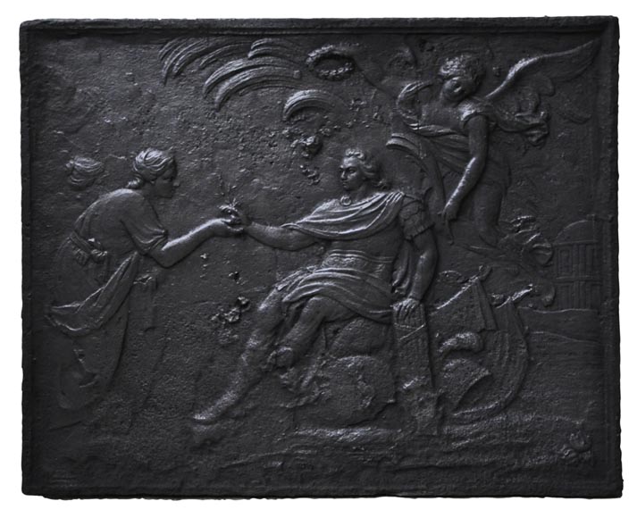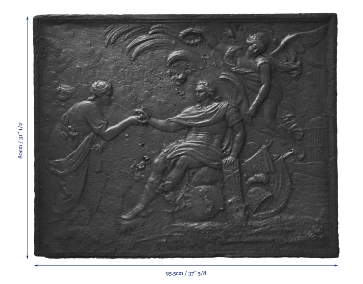 This antique Louis XIV style fireback was made during the 18th century. A sovereign, crowned with laurels by the renowned, gives alms to a peasant woman.