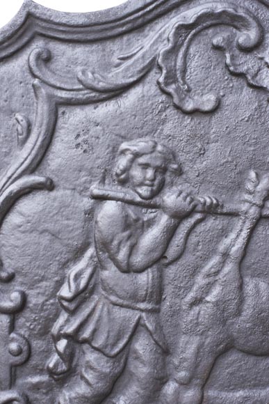 Made in the 20th century, this cast iron fireback depicts two hunters returning with their game, probably a deer.