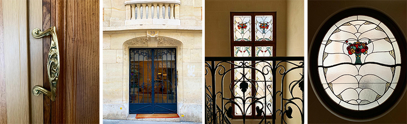 This decorative set is typical of the second art nouveau, around 1910. It is characterized here by a certain sobriety, attenuating the curved lines and counter-curves and announces the transition to the Art Deco style which is initiated from the 1910s. Given the great simplicity in the decorative forms, to which we can add the few sinuous lines, this set is hardly comparable with the great sets of interior decoration of Art Nouveau, although we find similar elements such as woodwork with rounded corners, typical of Art Nouveau.
