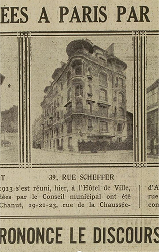 In 1922, a prize was awarded to the building of 39 rue Scheffer, on the occasion of the competition of facade of the City of Paris where six buildings were awarded by the jury. This competition, created in 1898 and which lasted until 1930, had for first goal to incite the architects to build original buildings, which were then awarded in the year of their construction or as here, a posteriori. This result was published in the Excelsior newspaper of July 28, 1922 with a photograph of the building and the name of the architect.