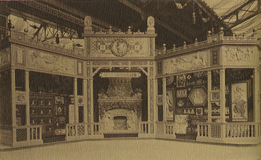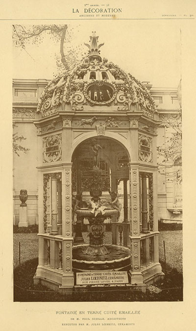 During this exhibition, as member of the jury, Jules Loebnitz presented an “exhibition of earthenware applied to architecture”, it was an “elegant portal adorned with enamelled tiles and terra cotta. The centre piece was a monumental brick mantel, adorned with enamelled ornamentation and under the arch two groups of life size terra cotta natural coloured figures; architecture by Mr. Paul Sédille, figures by André Allar”. The exhibition of 1889 was the height of the golden age for iron and ceramics.