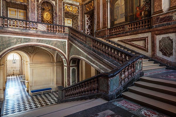 The Queen’s Staircase, Palace of Versailles, inlays made out of green Campan and Campan grand mélange marbles