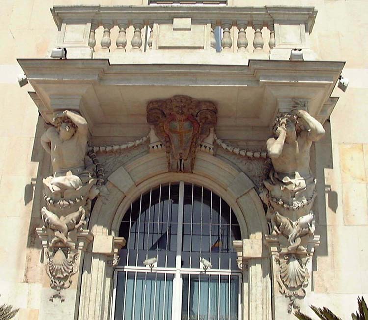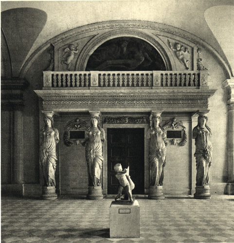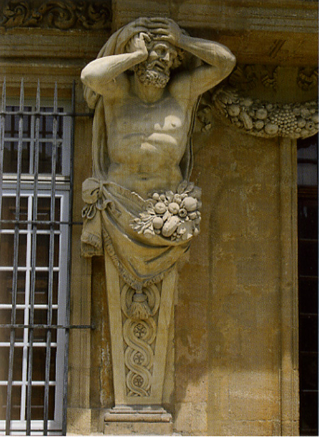 The male equivalent of a caryatid is a telamon or atlas. The name derives from the Greek titan Atlas (in Greek meaning “the bearer”), who Zeus condemned to support the heavens on his shoulders until the end of time. Atlas are figures of standing or kneeling men that were used in certain Greek temples. These architectural elements are more often called telamons in Roman temples.