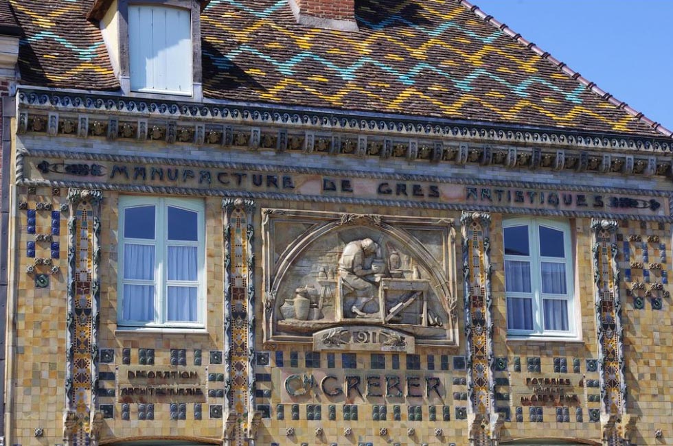 The work of Charles Gréber can be categorised into four themes : ceramic decoration for buildings, ceramics for interior and exterior architecture, and finally pottery. Architectural ceramics are found on Beuvaisien buildings as well as Parisian buildings, and fit perfectly in the architectural aesthetic style of Art Nouveau, from the 1900s, where the use of colour was highly important. In his semi-industrial production of ceramic coverings, his best work was his very colourful fireplace made out of flambé sandstone. When producing ceramic coverings, he used the principles of Art Nouveau, but adopted an even more energetic approach. He used even more geometric shapes in places where the original Art nouveau would have focused on a variety of foliage (roses, ivy; pine leaves).