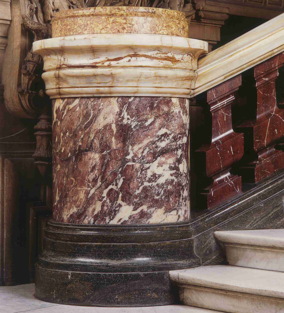 Fleur de Pêcher marble is a historic marble, used a lot during the 19th century to make exceptional works of art. For example the extraordinary fireplace in main hall of the Napoleon III appartments at the Louvre museum, decorated with babies in bronze that catch the light.