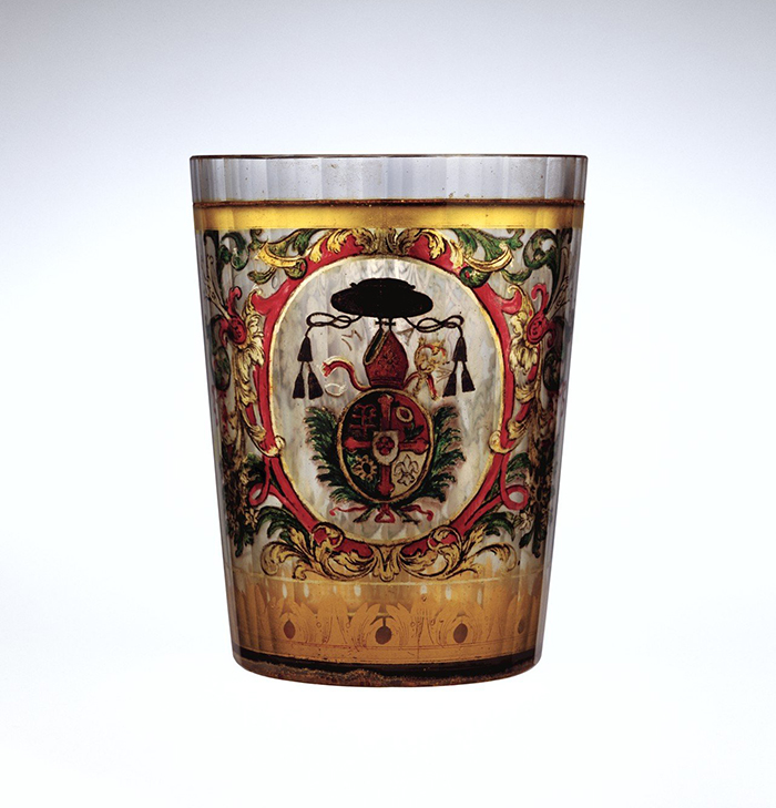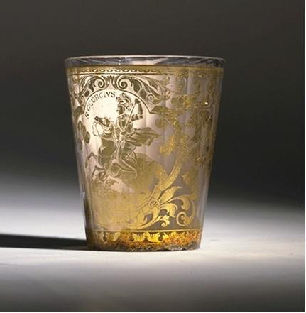 For the glasses, we can also use a technique of gilding paste known since the Antiquity but developed in Bohemia from the 17th to the 19th centuries and called "Zwischengoldglas", which means "Gold between glasses". These are two-part glasses that fit into each other. The inner glass is adorned with gold leaf on its outer part. The leaf is then engraved with the stylets. This first glass is then inserted in the second glass, slightly larger and the whole is welded.