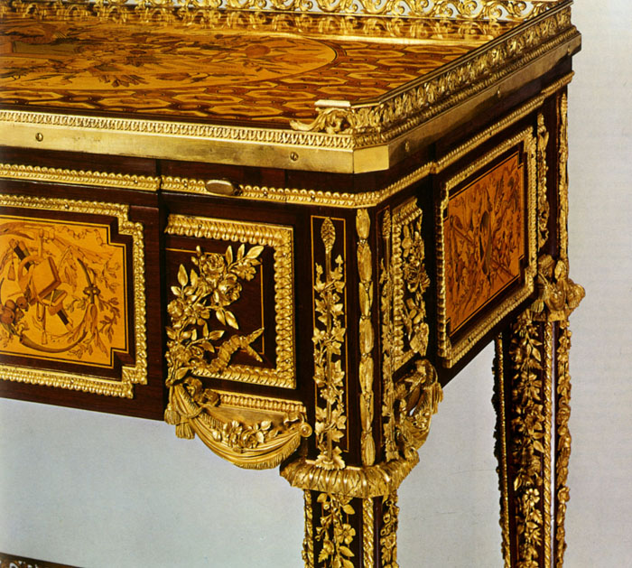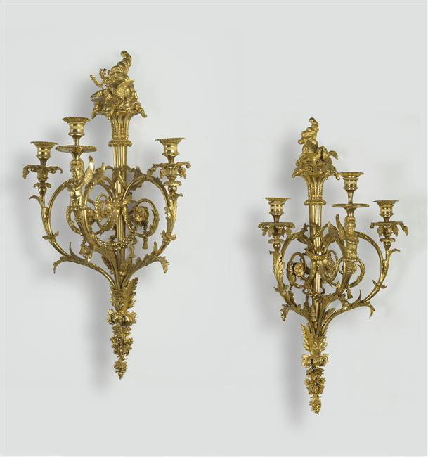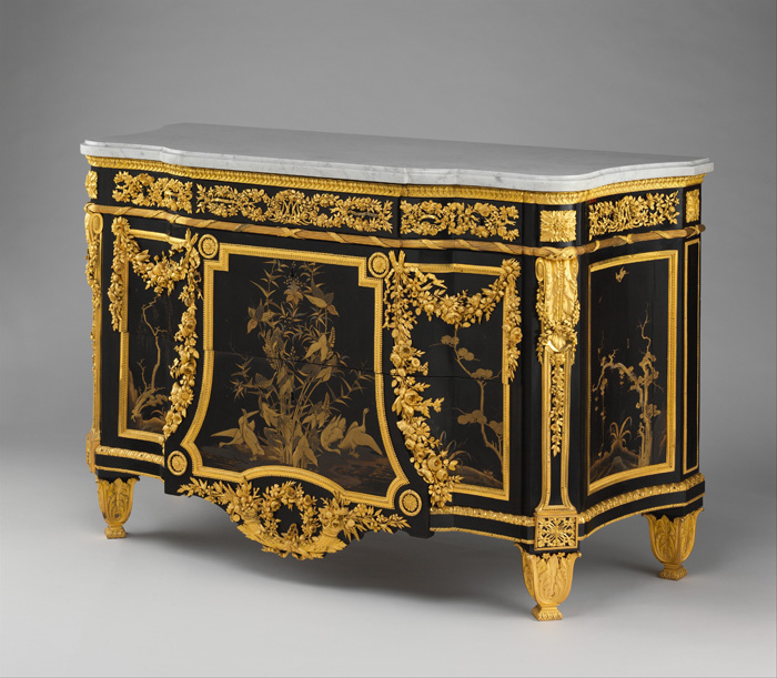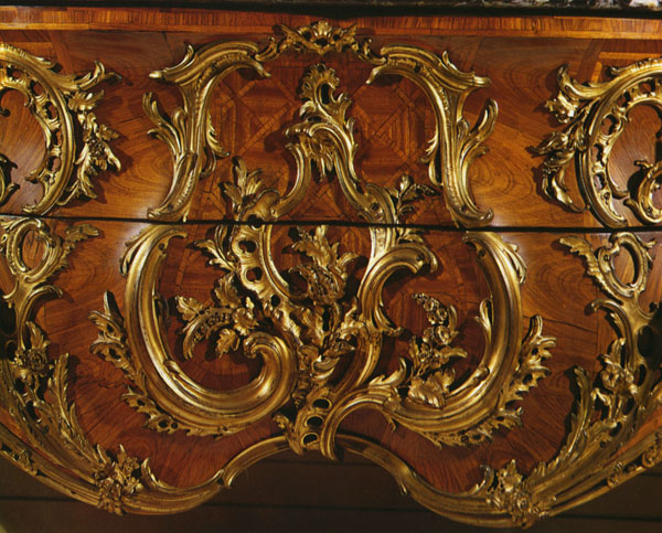 Under Louis XV, the use of gilt bronze continued to grow. Rococo-style furnishings were imaginative, with their fantasy, curved lines, asymmetry, and a sense of lightness and femininity. Gilt-bronze decorations were expertly crafted and represented rockeries, foliage, acanthus leaves, rushes, and shells. Louis XVI-style ornaments were much more minimalistic, inspired by Antiquity and nature, and many were especially designed for Marie-Antoinette. Tied ribbons, garlands, and draperies were frequent motifs. During the Second Empire and the Restauration, gilt bronze rose again. Napoleon III furnishings stand out for the abundance of richly crafted decorations, especially gilt bronze. An admirer of Marie-Antoinette, Empress Eugénie commissioned furnishings resembling the Louis XVI style.