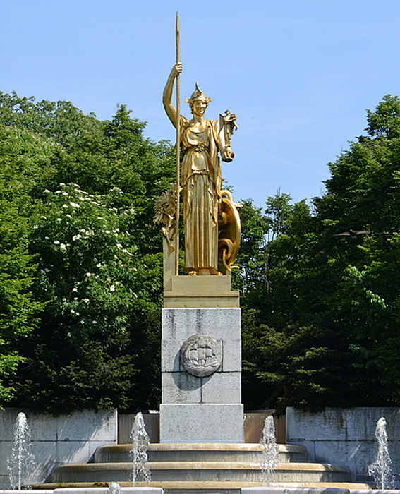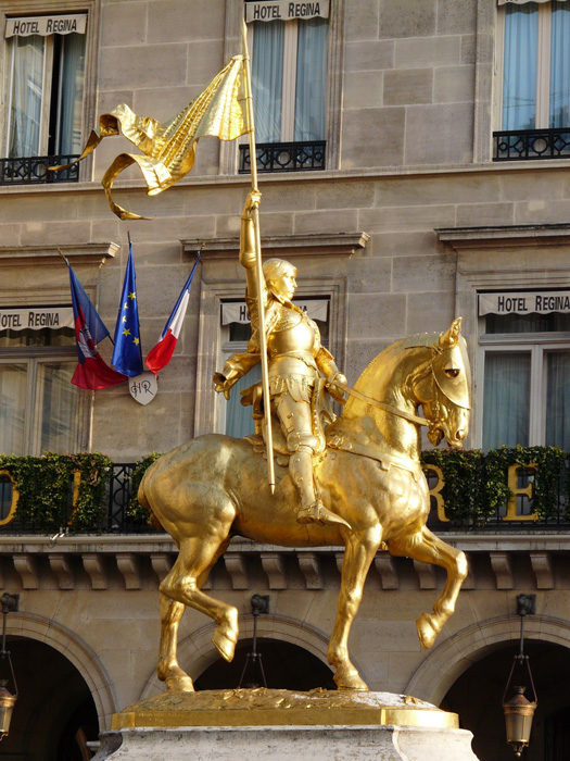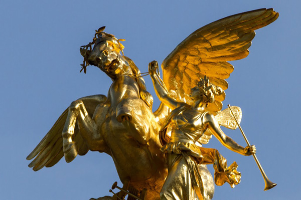 Gilt bronze can be found in fireplaces, on stairway railings, door locks, luminaries (chandeliers, lanterns, and candelabras), on furnishings, in clockwork (pendulums, clocks, and barometers), on mounted vases, fireplace frames, and ink-pots. Among the most beautiful examples of gilt-bronze statuary, we must mention the Pont Alexandre III (Alexandre III Bridge) in Paris and the four gilt-bronze statues placed on top of its pillars following the theme of Renown Holding Back Pegasus. This bridge, inaugurated at the World's Fair of 1900 , was designed by the architects Joseph Cassien Bernard and Gaston Cousin. The four Renowns were sculpted by Emmanuel Frémiet, Pierre Granet, and Leopold Steiner. Another example is the equestrian statue of Joan of Arc, Place des Pyramides, made by Emmanuel Frémiet in 1874. Finally, the monumental statue of Athena (about 10 meters high) that adorns the Fountain of the Porte Dorée in Paris was made out of gilt bronze by the sculptor Léon-Ernest Drivier for the colonial exhibition of 1931. It was situated in the Porte Dorée Palace peristyle, in front of the main entrance, and was titled “France bringing peace and prosperity to the colonies.”