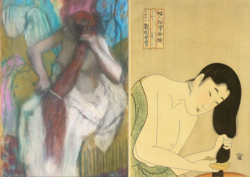 In painting, Edouard Manet, Mary Cassatt, Degas, Van Gogh, Gauguin were among those who were deeply inspired by Japanese art, affected by the lack of perspective and shadow, the flat areas of strong colour, the compositional freedom in placing the subject off-centre, with mostly low diagonal axes to the background. The Japanese iris, peonies, bamboos, kimonos, calligraphy, fish, butterflies and other insects, the blackbirds, cranes and wading birds, the cats, tigers and dragons were endless sources of inspiration, appropriation and reinterpretation for European artists. The occidental productions were combining styles and artistic conceptions instead of copying Japanese art slavishly. That is what brings to light the comparison between the artworks of Kitagawa Utamaro and Degas, of Katsushika Hokusai and Van Gogh (pictures 1 and 2).