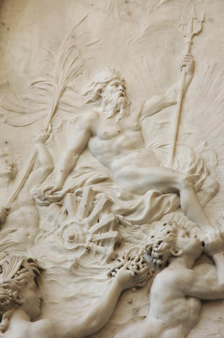 - He does not only refer to paintings, monumental sculpture also being an inspiring source: certain aspects of the Berwind fireplace low-relief recall the Neptune created by Coysevox's (1640-1720) for the Parc de Marly commissioned for Louis XIV (photo 13). The Triumph of Neptune and Amphitrite created for the Neptune Fountain of Versailles by Adam the Elder (1700-1759), also commissioned by Louis XIV, is comparable to the version made for the Vanderbilts (photo 14).