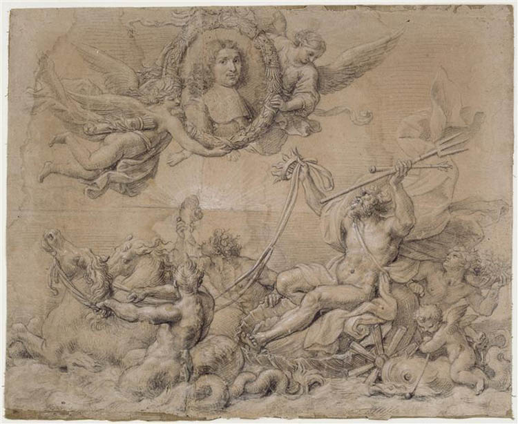 - Pierre Mignard (1612-1695), a famous court painter for Louis XIV, clearly had an important influence on the Berwind fireplace's Neptune. Mignard's preparatory drawing has the same chariot wheels as the ones on the fireplace: Neptune offre à Colbert la domination des mers (Neptune offers Colbert supremacy over the seas) (photo 8).