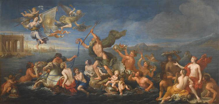 Historically, important dignitaries have often been associated to Neptune. In this way, in 1706 (or 1707), the count of Toulouse had wished for the painter Boullogne the Elder to make a representation of the marine procession for the King's bedchamber in the Château de Rambouillet, in a painting called Neptune amenant Amphitrite dans un char marin (Neptune bringing Amphitrite in his marine chariot) (photo 7).