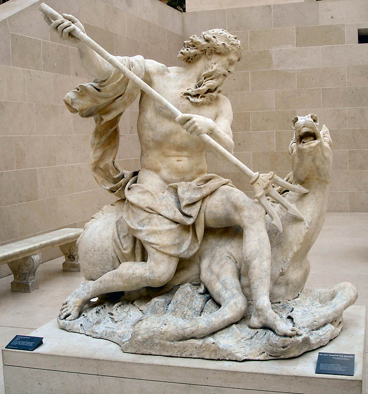 Both of these works of art correspond to classical academic iconography. Thus, Neptune is recognizable through his attributes: his beard and his trident. The vigor of the elements surrounding him emphasize his divine strength by the shaking waves and his windblown hair and beard.
