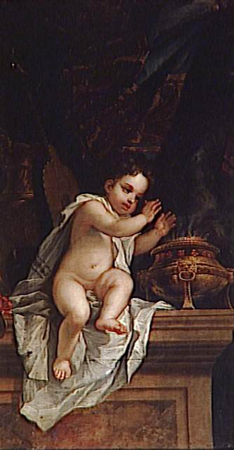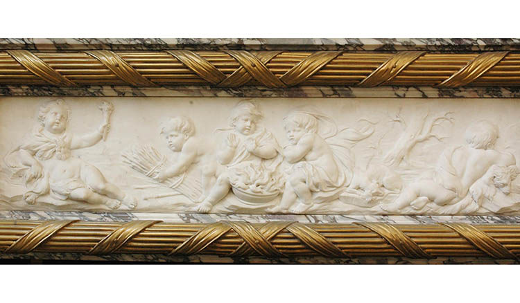 On the Berwind mantel, there is a decorative pattern of cherubs that symbolizes heat (photo 18). This iconography originates from allegories of Winter that were very common at the beginning of the eighteenth century (photo 17).