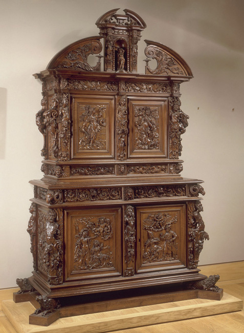 After the bloom of the Renaissance style, ornamentation was lacking, and sometimes geometric. Some of the distinctive elements of the Louis XIII style were diamond shaped sculptures and Maltese crosses. The mechanics of the lathe was perfected, and developed twisted columns, balustrades, chaplets for the bottom of tables, cabinets, chairs, armchairs, with armrests with a woman's head carved from a single block of wood, lion's muzzle or other little characters. Spools and rotors were frequently used as decorative attributes, cabinets and chests had flattened round feet.