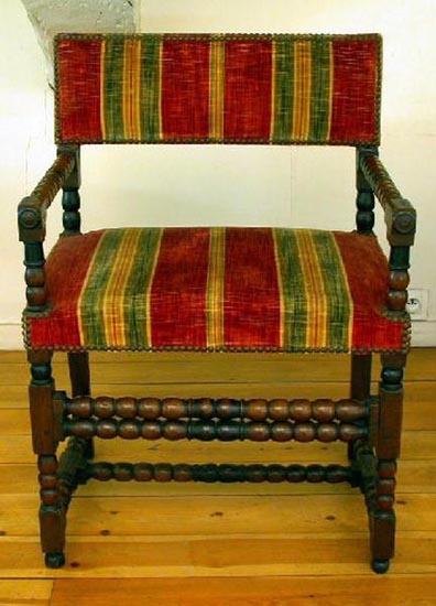 The seats were covered with tapestry or velor, coming from or inspired by Italy, like the velours de Gêne. The colours red and green were particularly popular. Seats were also covered in leather, held together by large round nails in wrought iron or in gilded or silvered bronze.