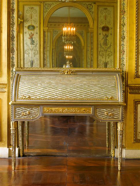 The seats were numerous, often less comfortable than under Louis XV, but finer and more harmonious. Like often in the furniture of this period, its legs had the shape of a column, fluted or in spiral, that is thinner at the base. The back was rectangular or oval, and sometimes they were partially opened to figure a lyre, a balloon or even a basket. The cylinder desk, from which the top rolls into the piece of furniture when the desk is opened, were in vogue. The cabinetmaker Riesener, undisputed master of Louis XVI’s furniture, made several ones for the king. The window displays appeared at that time when art began to be available to more people. The use of gilt bronze was massive, and today this production is one of the most rated of the 18th century. The pendulums, adorned with allegorical characters and with shapes often taken from architecture- obelisks or even triumphal arch- flourished extremely fast and decorated the fireplaces. The taste for the wallpapers appeared, and the Queen diffused them to the Court to brighten the insides, under the aegis of the important Reveillon manufactory, which was situated in Paris, near the Bastille .