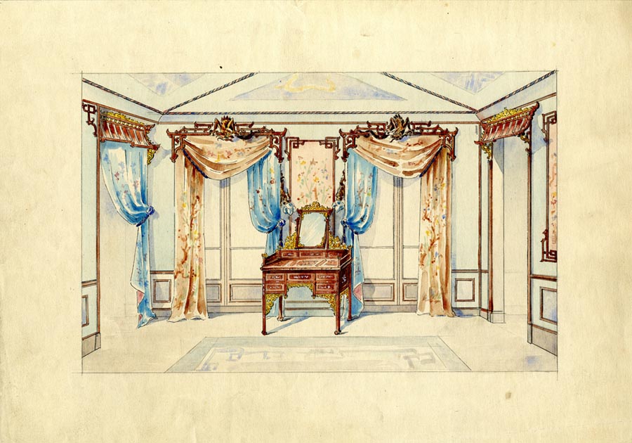 Towards the end of 1894, Perret and Vibert changed their shop at rue du Quatre-Septembre by creating ten new rooms, which were used to exhibit their Japanese and Chinese inspired furniture.