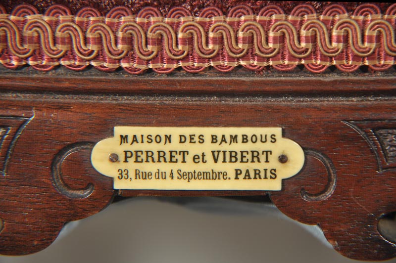 Alfred Perret appeared on his own in the Trade Directory of Didot-Bottin of 1879, under the category “bamboo articles”. Situated in the second arrondissement in Paris, he specialised in “luxury basketry, bamboo furniture and garden features”, and in 1880 he was classed as a manufacturer. We know that Alfred Perret was present at the Universal Exhibition of 1878, which proves that he must have been active before this date. However the Didot-Bottin doesn't talk about his work during the preceding years, making it hard to retrace the history of this company “La Maison des Bambous”.