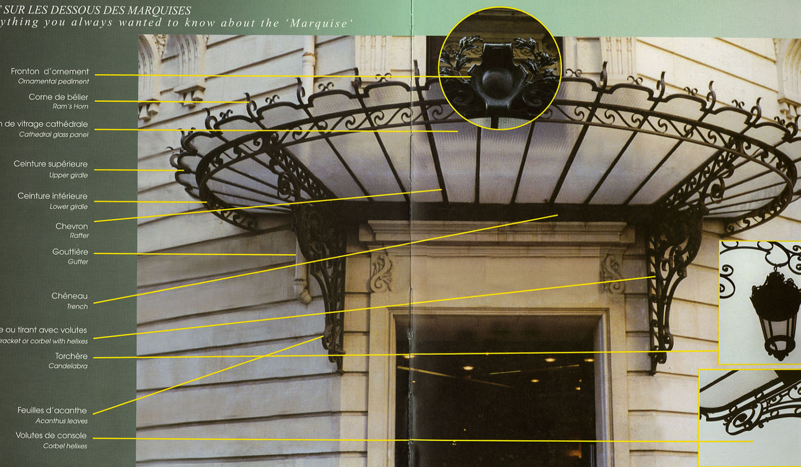 Download PDF Originally a marquee - or marquise - was a cloth canopy set up before a tent or building for protection from the rain and sun. They were found especially on boats. Architecturally a marquise is a permanent protective canopy often made out of metal and glass projecting over an entrance, a porch or a window, and which serves as a shelter. It is both an architectural decoration and a useful urban shelter. A small projecting roof, it can be called a marquise only if it is a metal structure paned with glass (either clear or cathedral glass, with a metal grille) often with a curved belt above and supported by brackets. Both the brackets and curved belt are made out of cast iron, the brackets are designed to hold it up against the wall through force. They are thus called cantilevers or cantilevered suspensions. Real glass, tightened with steel, marquises can be quite elaborate, decorated with wrought iron ornaments like volutes, and often adorned with beautiful lanterns. It generally reaches up towards the sky, so rain runs back down towards the gutter against the wall and falls down the drainpipes often referred to as columns.
