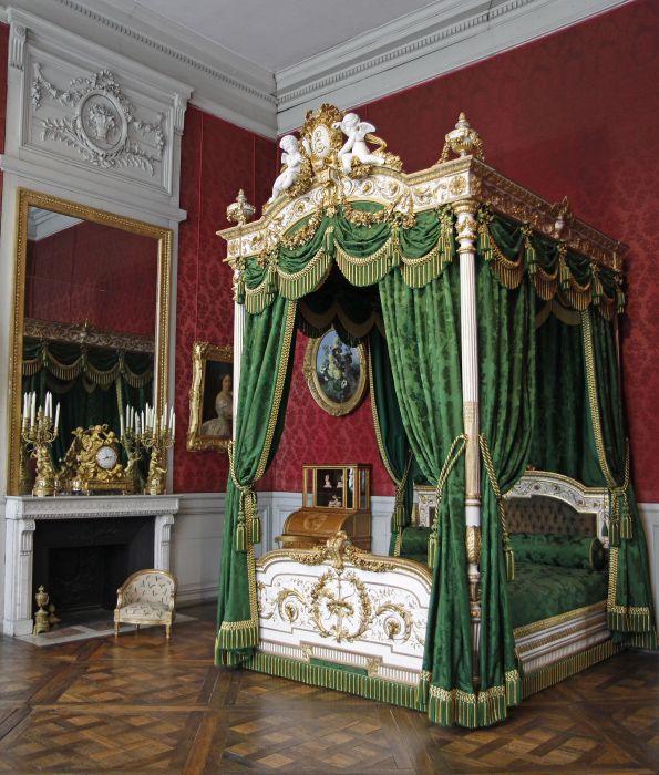 The Louis XVI style or more precisely the furnishings made for Marie-Antoinette set the tone for the Second Empire interiors. The Empress Eugénie, who adored Marie-Antoinette, initiated the resurgence of Louis XVI-style elements such as flower-baskets and tied ribbons. The Louis XVI-Empress-style copied and was inspired by the works of Carlin, Weisweiler and Riesener and was presented to the public at the Universal Exhibition of 1867 .