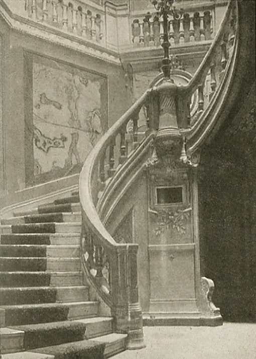 The architect Pierre Manguin made an elegant décor following the French Renaissance style, his inspiration deriving mainly from the Fontainebleau school, for the Marquise de Païva hotel (1819-1884) on the Champs-Elysées. The hotel is decorated with paintings by Gérome and Baudry, sculptures by Aubé, Barrias, Carrier-Belleuse, Dalou. The hotel held great events, in which some of the guests included, Émile de Girardin, Émile Augier, les Goncourt, Edmond About, Delacroix, Théophile Gautier, Arsène Houssaye, Taine, Sainte-Beuve and Gambetta. The doors made out of carved bronze were made by the sculptor Legrain; in the inside, the famous staircase made out of moulded and carved Onyx marble is typical of the Napoléon III style.