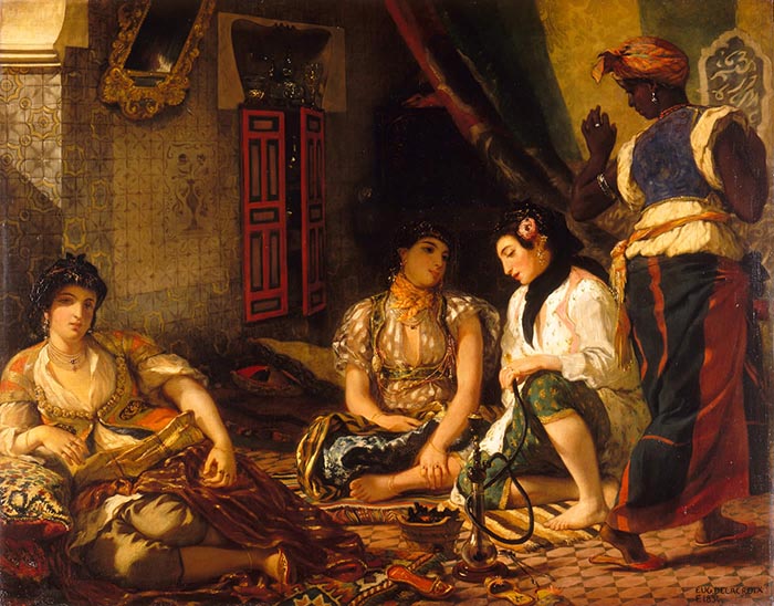 Orientalism, which corresponds to the romantic taste for foreign lands, has given rise to oriental completely fantasized representations and especially as Orientalism has vague geographical and historical boundaries. Realism and ideal are mixed in this new pictorial wave: Orientalism, in other words the Western vision of the East, is born. Algeria for example becomes a source of inspiration with the colonial expansion (Charles X decides in 1830 the French expedition). Delacroix thus paints Women of Algiers: in languid postures, the women have an idle life. Oriental women, indeed, fascinate Europeans. Associated with a provocative and nonchalant sensuality, and a certain mystery imbued with power and charm, they become one of the preferred motifs, whose Ingres is inspired by in his Turkish Bath with the multiply nudes painted according to the classic canons.