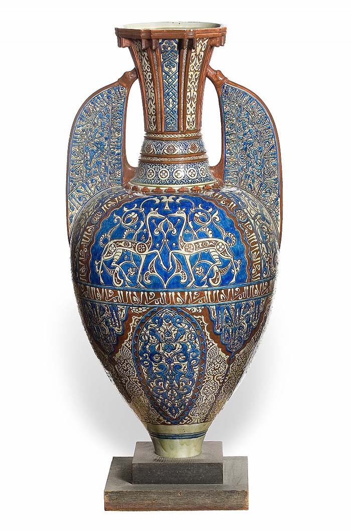 After having widely inspired painting and literature in the first half of the 19th century, Orientalism, thanks to the World’s fairs, spreads out in decorative arts and architecture which take their motifs and their techniques in the Orient. From the World’s Fair of 1867 , Europeans are both tempted and surprised by the many Eastern pavilions, like the one of the Ottoman Empire built by Léon Parvillée. Ceramists and glassmakers in particular, such as Theodore Deck and Philippe-Joseph Brocard, take their techniques and their decorations from the Arab art they want to compete. Inspired by Moorish Spain, now included among the Orientalism, Théodore Deck sepcializes into turquoise ceramics with plant motifs.
