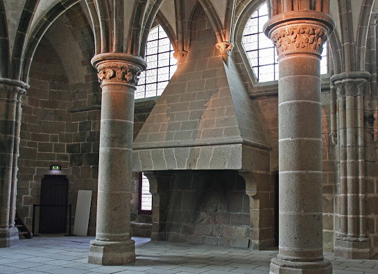 In the Middle Ages, the fireplaces, that first appeared in 9th century, are crowned with massive chimney breasts, sometimes built up to the ceiling, and under which one can stand up, like in the Knight’s Room of the Mont Saint-Michel. The Hôtel Jacques Coeur holds a splendid fireplace whose Gothic breast is in sculpted stone. The top of the fireplace is indeed fit to a sculpted or painted decoration on wood or stone. When the chimney ducts are incorporated inside the walls or outside the buildings in 15th-16th centuries, the mantel gets smaller and accepts a decorative role. The magnificent Renaissance style fireplaces of the Chateau of Blois and of Ecouen illustrate the use of fireplace mantels as a ceremonial surface. Francis I appends his salamander on the mantel, enhanced with gold, which must have been a hypnotic vision in the light coming from the fireplace.