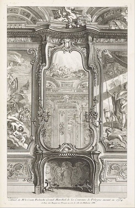 In the beginning of 18th century, under the Regency, the aristocracy has the designers imagining light overmantels receiving broad mirrors, that multiply space and create a fairy world with the reflection of chandeliers. The casing is lowered so that one can enjoy the mirrors. Boffrand’s Regence decorations for the Hotel de Soubise are typical, with a multiplication of mirrors decorated with garlands.