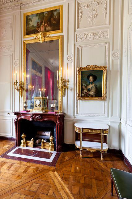 The Louis XVI style overmantel embodies the purity of the style, often composed by a huge arched or square mirror, in a delicate white or gilded frame with few or no ornament. Charles de la Fosse announces the Neoclassical style with his antique-inspired sobriety. Sobriety rules as well in Marie-Antoinette ’s Apartments in Trianon, where the decoration obeys to the “square” vogue.