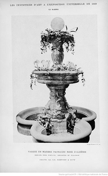 At the World’s Fairs , the Paonazzo marble is chosen several times by artists for their exhibition works. A Paonazzo marble fireplace, decorated with sculptures by Mathurin Moreau, could thus be admired at the World’s Fair of 1900 . It was a Louis XV style fireplace , designed by H. Pain and exhibited by Lapointe, that was awarded a Gold Medal. It is also a fireplace in Paonazzo that adorns the Art Nouveau Livingroom built by Louis Sorel for a merchant of Reims, in 1910, reproduced in “Art and Decoration”.