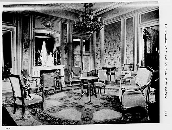 Livingroom for a villa by Louis Sorel, with a fireplace in Paonazzo, Art et Decoration, 1910.
