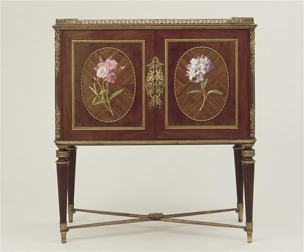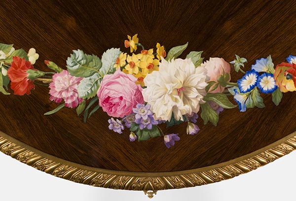In particular, he signed the flowers adorning Empress Eugénie’s Jewel Case, which she bought after the World’s Fair of 1855 , and is today kept at the National Museum of the Chateau of Compiègne. In 1852, he painted the inlays of a table preserved in the Murska Sobota Museum (Slovenia), then in 1853, those to be inlaid by Tahan in an impressive flat desk, entered in the Marc Maison Gallery collections. The Gallery contributes in a continuous research to identify his various contributions to Rivart’s porcelain inlays, and also identified his signature on a pair of side cabinets, signed 1854.