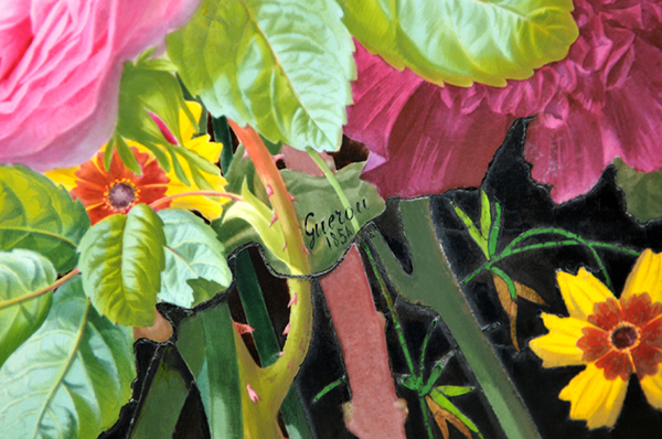 A painter of flowers, Pierre-Joseph Guérou perpetuates a difficult art to which Pierre-Joseph Redouté, "the Raphael of flowers", had given its nobility in the Age of Enlightenment, both by the illustration of the most important botanical textbooks, and by painting. Classified as a minor genre of painting, landscape becomes a noble and grandiose subject with the romantics. Thus, in 1849, George Sand had seen Delacroix "in ecstasy in front of a yellow lily whose beautiful architecture he had just understood" (La Revue des Deux Mondes, June 1, 1860). The painting of flowers is thus revalued by this poetic sensibility, and invades the interiors decoration. It is also not uncommon for small merchants to commission flower paintings from young bohemians for their clientele.
