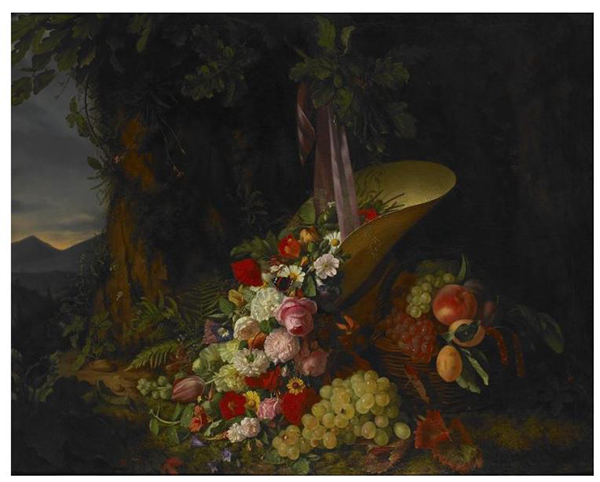 A member of the 1830s youth, which had turned to painting, engraving and literature in France, Pierre-Joseph Guérou appeared for the first time when he was only 18 in 1836, for having proposed two Watercolors at the annual painting Salon, a Carnation Study and a Hollyhock. Guérou is indeed from the generation growing up in the romantic years, like Théodore Chassériau or Gustave Courbet, where reigns the cult of Nature. Thus, he might have wished to follow the footsteps of Simon Saint-Jean, the young painter who in 1833 had made a great impression with Flowery Hat, flowers and fruits, a still life where a bouquet of flowers was staged in a landscape.