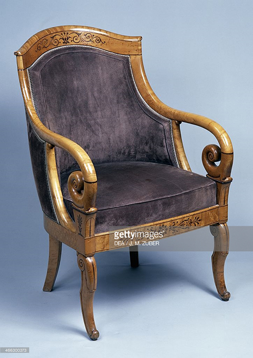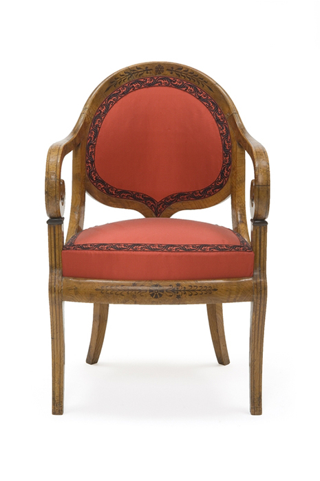 One can observe this passage on the gondola armchair, known in the Empire, which will be a favorite piece of furniture during the Restoration. For this furniture piece, as for chest of drawers and tables, mahogany is sometimes used, but it is most often built in light woods, more accessible wood species. The ornamentalists play on the marquetry of these different woods, delicately designing fine volutes and friezes, rather than resorting to ornamental bronzes. Charles X rewarded François Baudry for his elegant model of a gondola armchair, which had been able to innovate in the backrest shape, and whose fine frieze patterns are characteristic of the Restoration style.