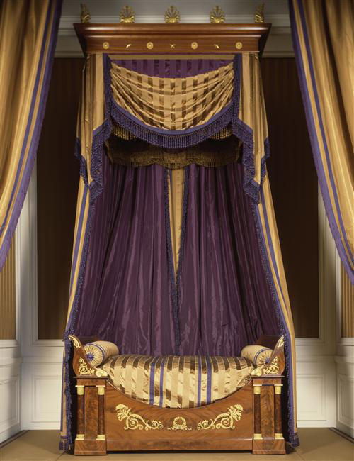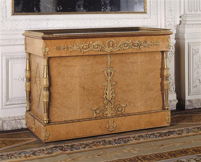 The weakened economy at the end of the Napoleonic wars did not allow the crown to commission important works so that Louis XVIII re-used the furniture in place; Charles X, on the other hand, his successor in 1824, will be known for his authority and his desire to restore the Kings of France’s image. The great commission of the Restoration is thus the bed Charles X ordered to Pierre Gaston Brion, artist of the Empire, for his room at the Tuileries Palace. The style of this impressive bed affirms the continuity between the Ancien Regime and the Restoration, but in its desire to compete with the Napoleonic style, it also prolongs its pomp.