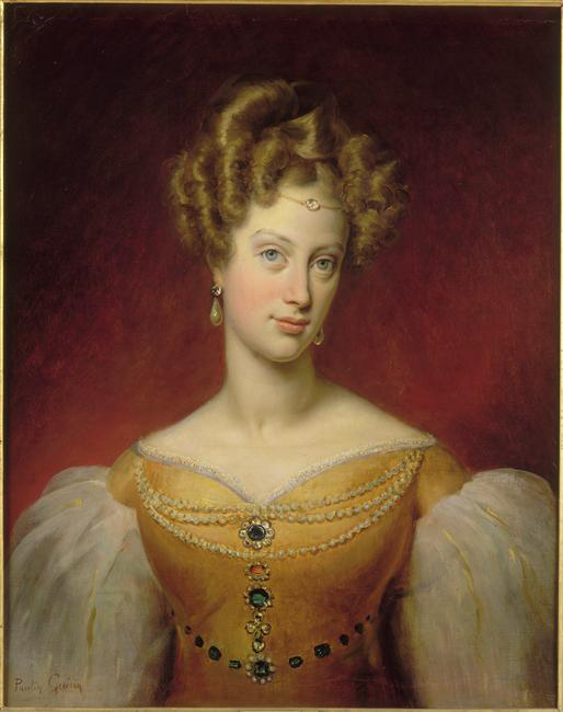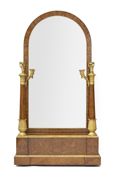 The Duchess of Berry is an important patron, especially for the decoration of her apartments at the Tuileries Palace. The cheval mirror she acquired in 1823 is a fine example of the stylistic novelty of solid curves combined with a fine work of marquetry, which nevertheless ensures a continuity with the Neo-Classical style. Known for her outfits inspired by the Middle Ages and the Renaissance, her portrait in 1816 also reveals the Romanticism that begins to animate Europe. Around 1820, under Charles X, the Middle Ages would indeed exert a strong fascination on the spirits, giving birth to the Troubadour style and the Neo-Gothic style.