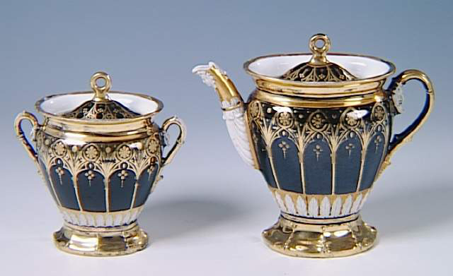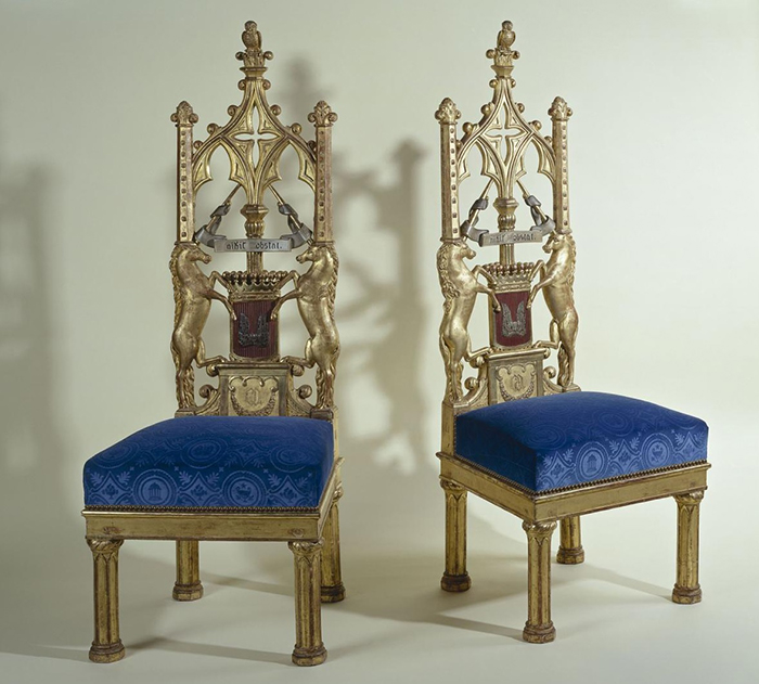 The "cathedral" style makes its appearance, notably with the Gothic cabinet of the Countess of Osmond, a Troubadour reception hall. The chairs preserved at the Petit Palais show this enthusiasm for a reinvented Middle Ages, bearing unicorns and Gothic lancet archs. Medievalism attracts a wider audience, which has repercussions on the decorative arts: forms like the lancet or the diamond, the transposed motifs of Gothic architecture invade the decoration, even teapots.
