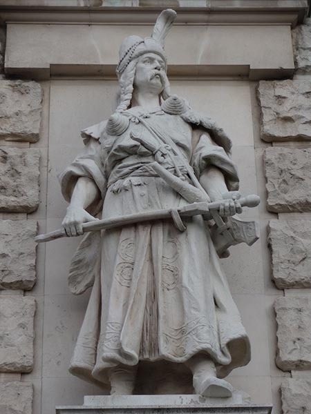 For the city of Vienna, he made the statue of Charles VI of the Kunsthistorisches Museum (facade of the Maria Theresa square), the decoration of the Natural Museum cupola, two bas-relief for the University (Prosperity and Industry), and two other reliefs for the bronze door of Equitablepalais (1890/1891). From 1894 to 1898, he realized two bronze lions for the Nussdorf docks, as well as a Magyar soldier for the Neue Burg front. Last but not least, Saint Peter’s Church of Vienna is decorated with a bas-relief by Weyr, depicting the legend of its founding by Charlemagne. In several of these works, one can notice the artist’s affection for folkloric costumes, in particular on the Magyar statue and St. Peter’s bas-relief.