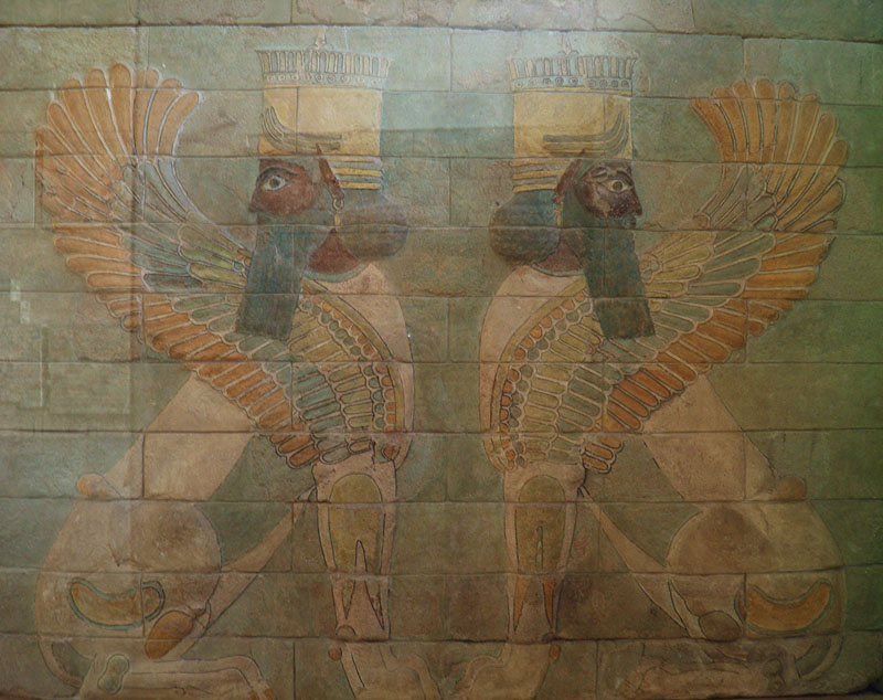 The Sphinx appeared in Mesopotamia during the 2nd millennium BC as a winged lion with a human head and bull's horns. Sphinxes were represented on seals, wall paintings, and as monumental statues in front of palace doors, like in Nimrud and Khorsabad. It was sometimes confused with the lamassu, a protective mythological Assyrian creature with a human head, a bull's or lion's body, and wings. It may be an Assyrian version of the sphinx.