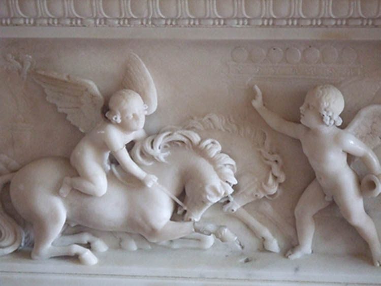 Carrara marbles have always been the most popular marbles and have been used to create exceptional works of art. Many mantels have been made out of this marble. The “ Hotel de la Marine ” in Paris retains many fine antique mantels made out of this marble, including those in the “ Salon des Amiraux ” and the “ Salon Diplomatique ”. Le “Salon Violet ” in Chantilly also features a beautiful mantel out of Carrara marble decorated with bronze. The rooms of Egyptian antiquities in the Louvre Museum in Paris also feature a beautiful mantel enitrely carved out of Carrara marble and with lion shaped jambs.