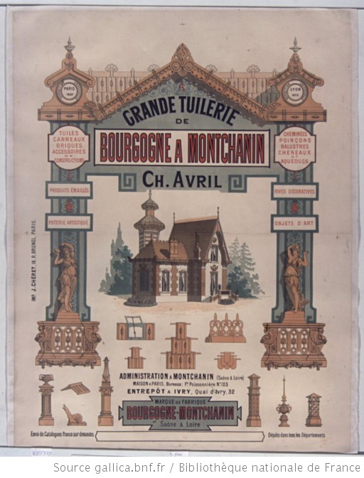 Like for the Provence, the production of tiles knows an important success from the 1850’s and during a century before declining in the late 20th century. Montchanin for instance was the head quarters of one of the most important tiles factory in France. Developed by Charles Avril (1817-1891), it becomes the mecanical and perfected Grande Tuilerie of Bourgogne and merged in 1938 with the Société des grandes tuileries bourguignonnes of Chagny. After 1945, the competition of new materials provokes a progressive decline and the business closing in 1967.