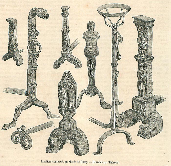 The utility of the andirons quickly became obvious. The ruins of Pompeii show that lifting fire on iron bars was already a known process in the Antiquity. In the Middle Ages, the andirons are very tall, as are the fireplaces, and are equipped in the kitchen with receptacles to keep dishes warm.