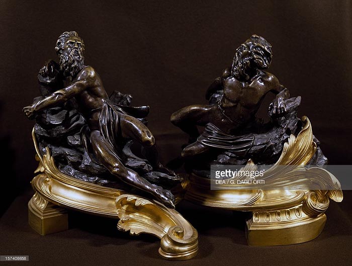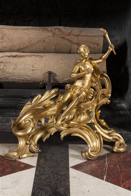 The 18th century, true golden age of andirons, leaves out silver and brass to the benefit of gilt bronze. Like the rest of the interior decoration, the andiron is designed and redesigned by the great ornamentalists of the Louis XV and Louis XVI styles, to the extent that Versailles Palace and Trianon have a very wide variety of them.