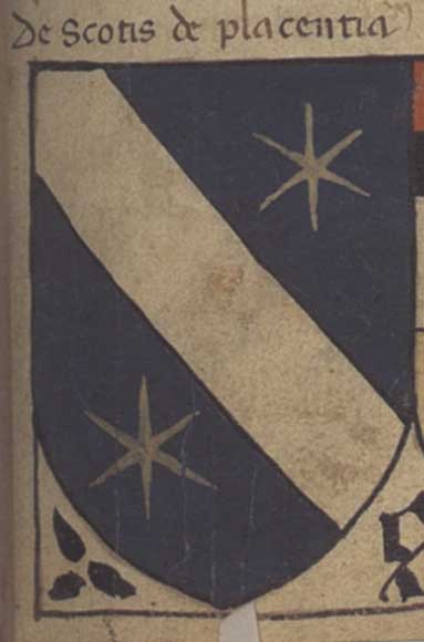 The arms of the Scotti on the right: from Azur, a bend argent accompanied two golden stars. The Anguissola arms has a small circle towards the bottom. This detail indicates that the arms belong to a specific member of the family, a younger brother for example.